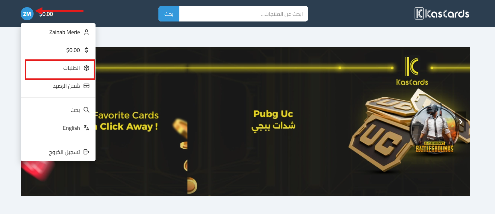 اتبع الخطوات التالية للوصول إلى أرشيف مشترياتك، معرفة حالة الطلب، واستخراج كود البطاقة: